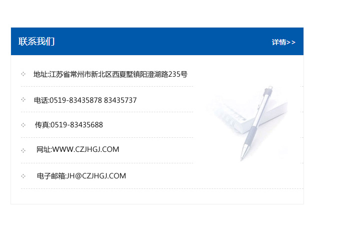 地址:常州市新北區友邦商務大廈1幢16、17層  電話:0519-85101652  傳真:0519-85112595  郵編:213022  網址:www.cz-jiayue_cn.qqgkhl.com  郵箱:xiajifengaa@163.com